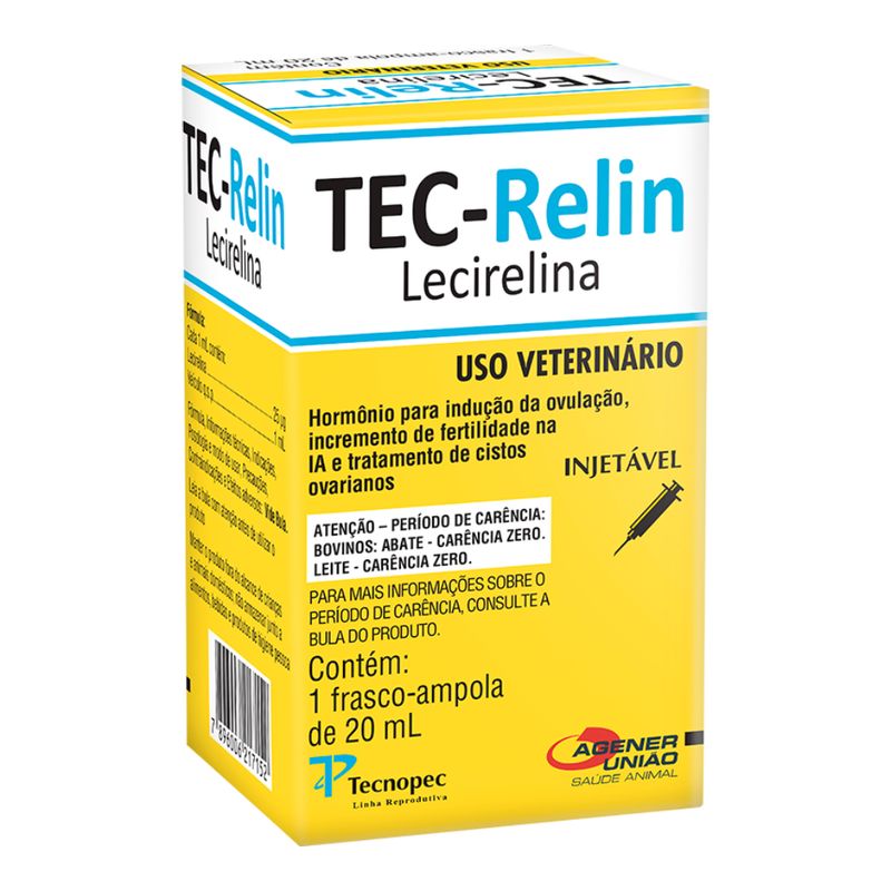 O Hormônio Reprodutivo> Tec-Relin 20ml Tecnopec, é indicado para indução da ovulação e aumento da fertilidade em protocolos de inseminação artificial (IA) em fêmeas bovinas.