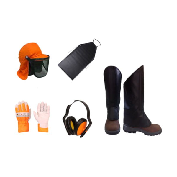 perneiras de couro, luvas de segurança, avental impermeável, protetor auricular e conjunto de proteção facial com touca, garantindo proteção integrada para pernas, mãos, tronco, audição e rosto. A marca
